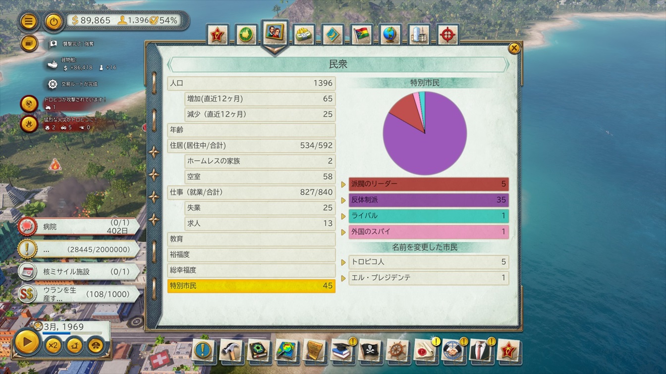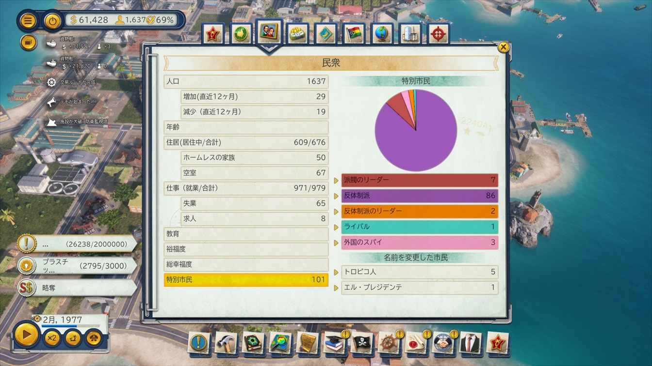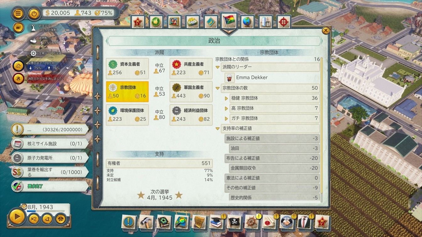 国内政治派閥を見ても人口の大半が軍国主義者でその軍国主義者は非常に満足しています。一方宗教団体は以前より人がちょっと増えていますが島の総人口があの時と比較して倍近くなっている中での微増なので実質的に数を減らしているともいえます。