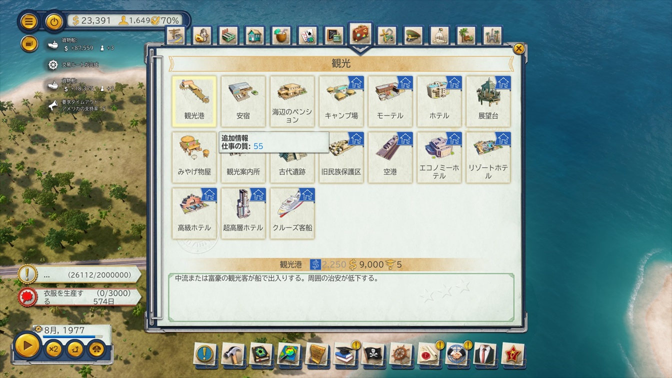 観光客を呼び寄せるには基本的には観光客用の港か空港を建設していく形になります。