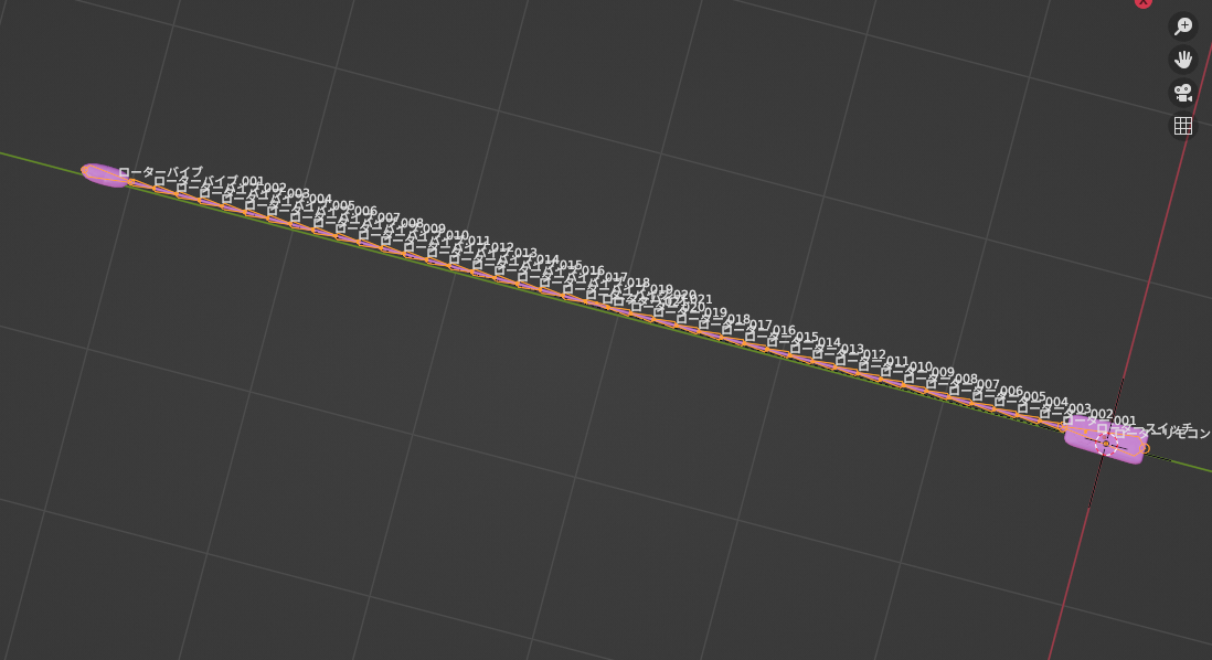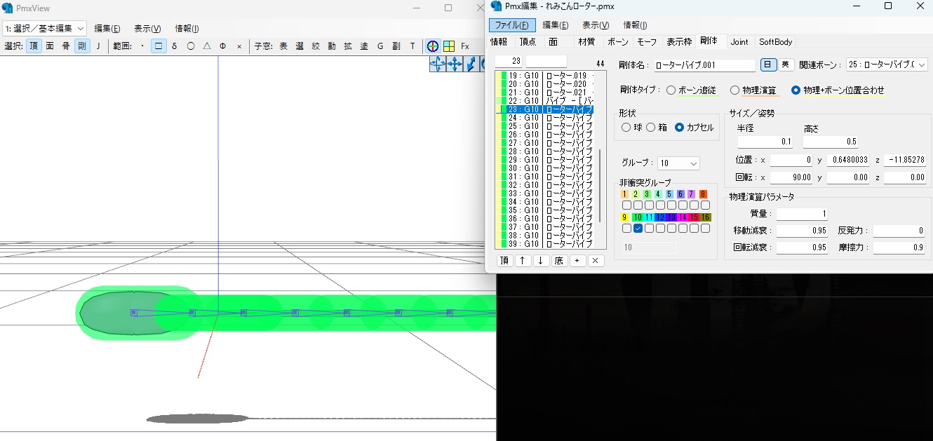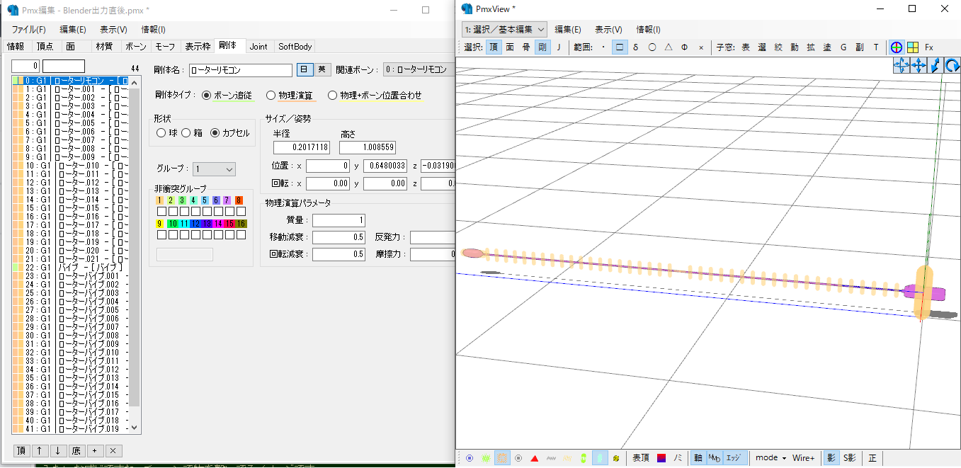 今右の画面的にはぶつかってはいませんが向きを整えて一本の線になるようにしたら剛体同士がぶつかり、同じコードなのに当たり判定として接触しまくって大暴れするこおtになります。それを回避するために全部同じグループにして指定した非衝突グループにチェックを入れておくという訳ですね。