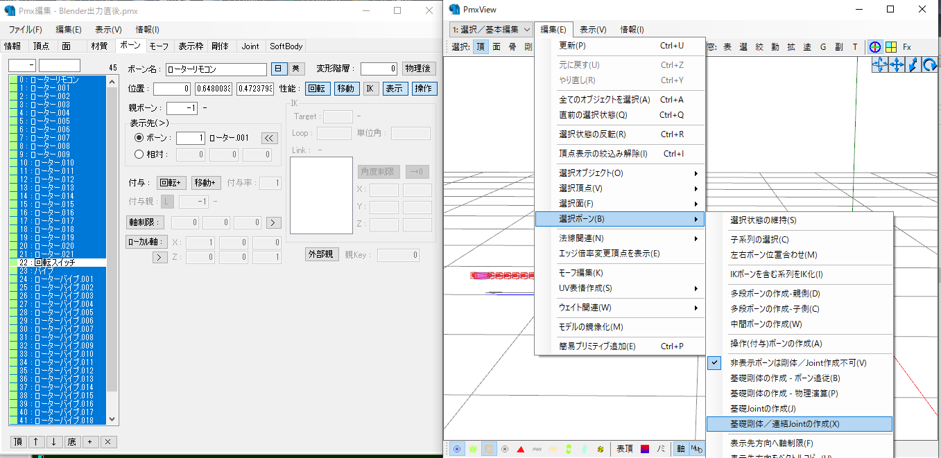 物理で揺れるコードを支えるリモコンとバイブの部分に加えて物理で揺れるコードの箇所のボーン全部を選択し、その後 選択ボーンから基礎剛体/基礎jointの作成を選択して剛体とjointを作成します。