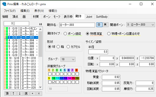 また、このままだとリモコンもバイブも全部物理で揺れる対象となってしまうので、リモコンとバイブは自分の手(?)で動かす所になるのでpmxeditorの剛体タブからリモコンとバイブの所をボーン追従にします。