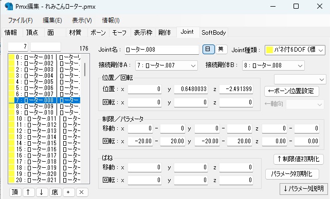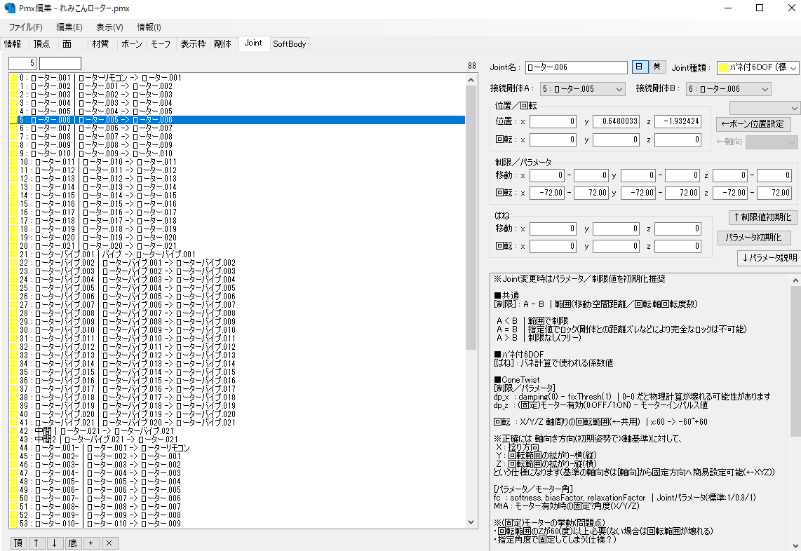 例えば片方でも接続先の存在していないjointがあるとMMDは強制終了します。上記手順に従って作業するとリモコンとバイブで剛体の接続されていないjointが二つ存在するためそれらは削除します。